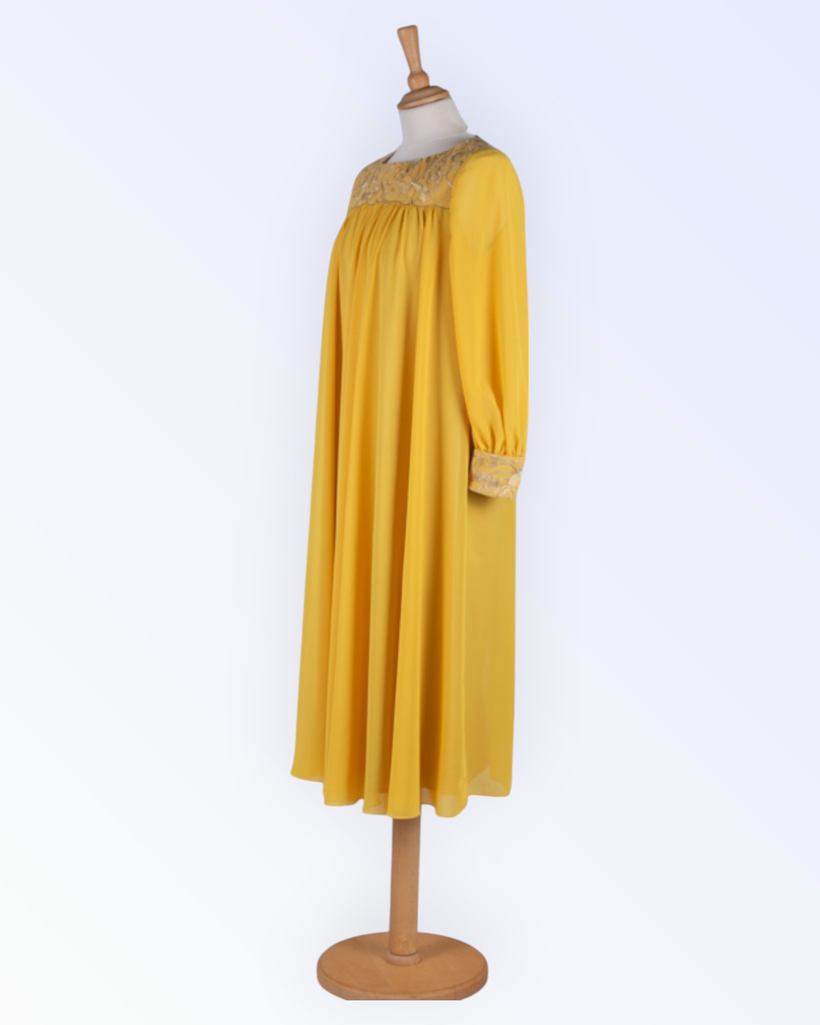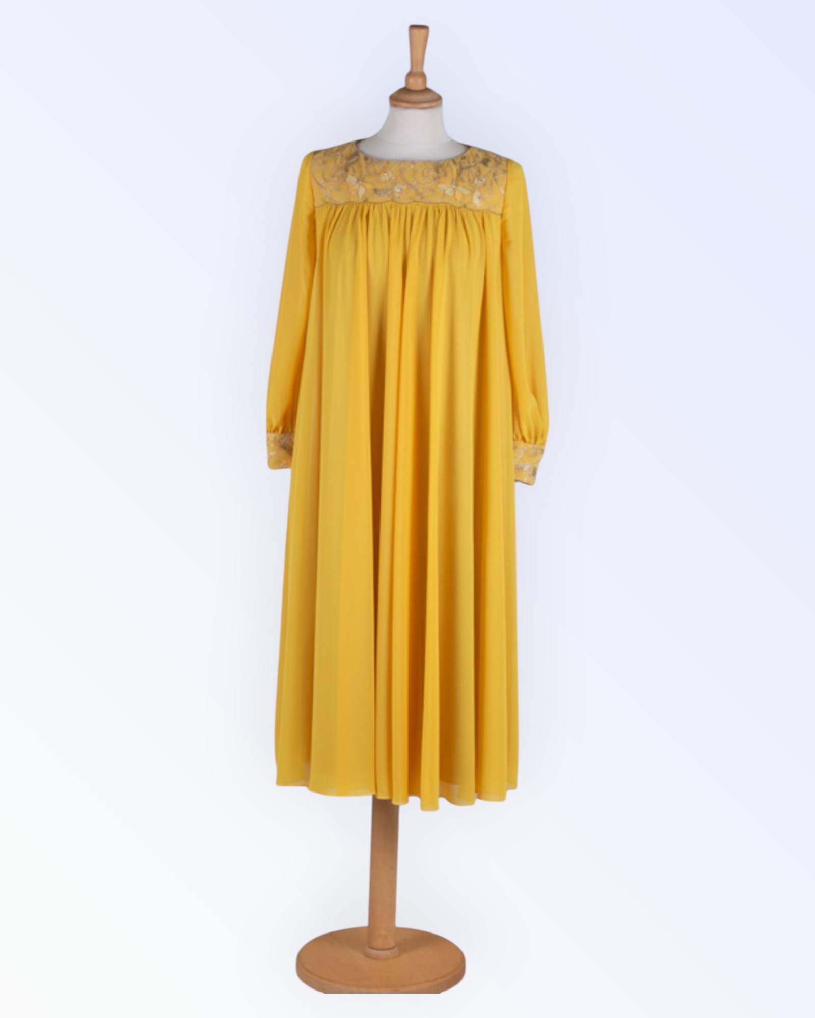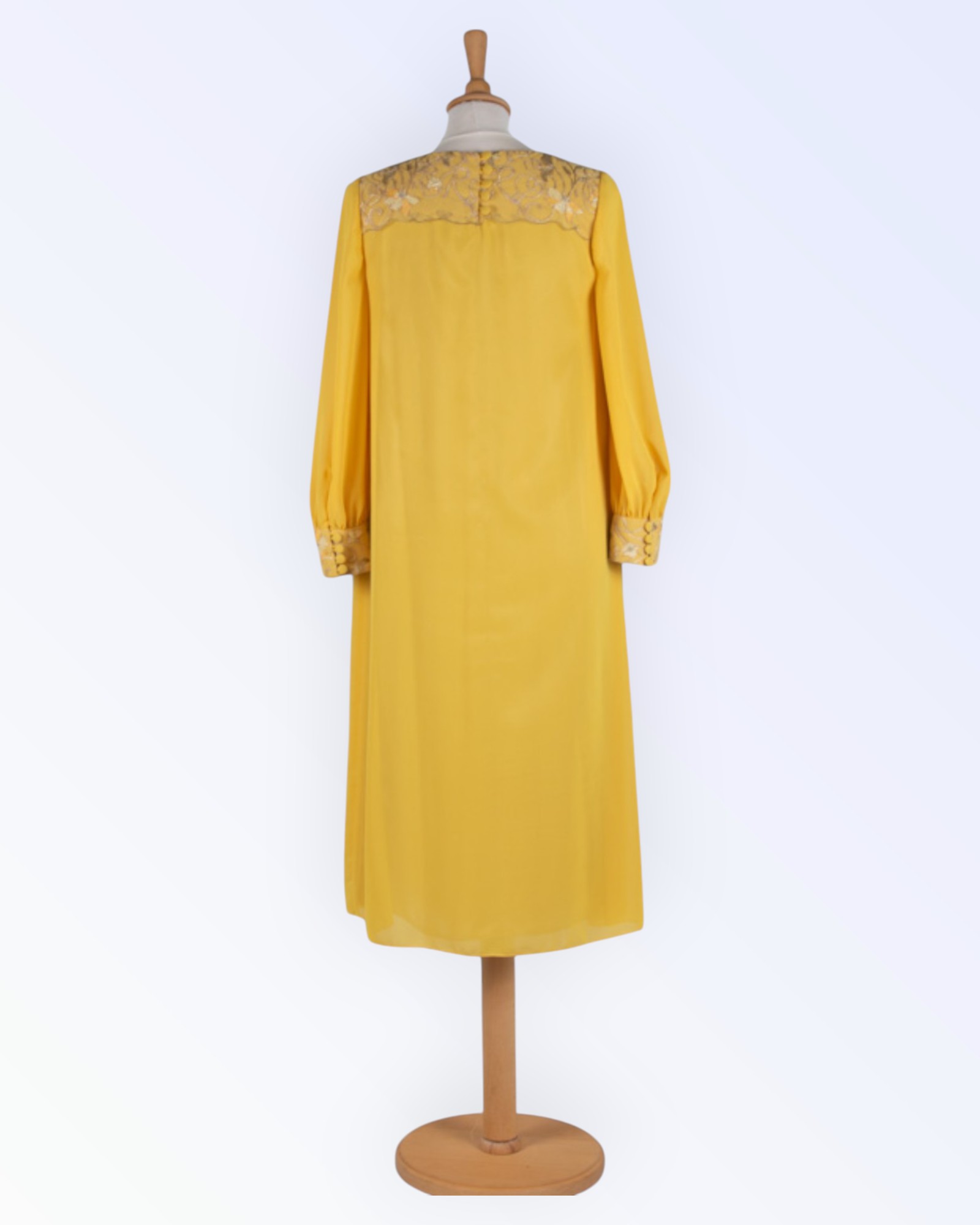 Kollasest šifoonist pidulik kleit, millel on kivikestega kaunistatud pitsist õlaosa ja mansetid. Avara lõikega kleit sobib ka tulevasele emale. Ainueksemplar!