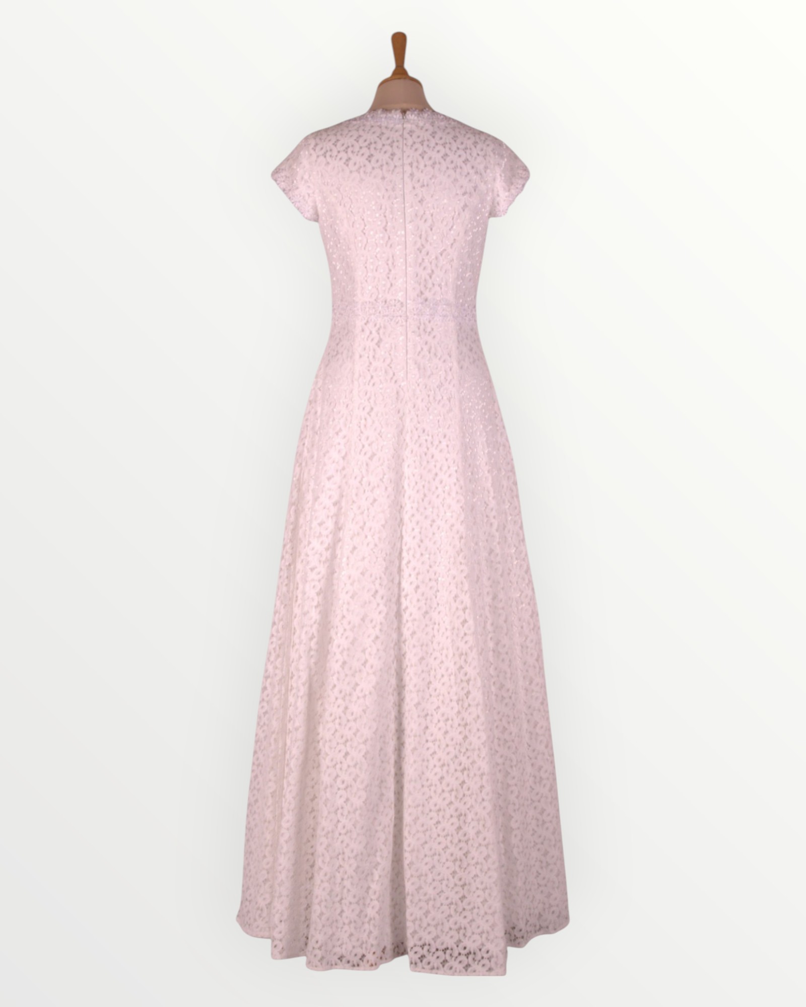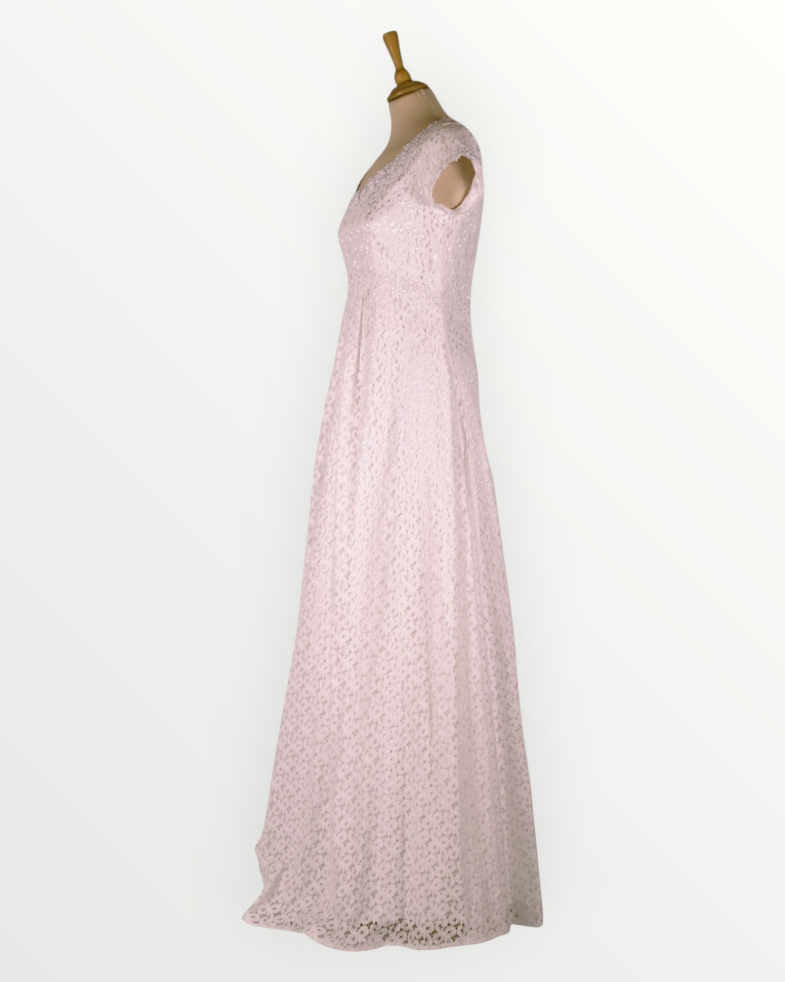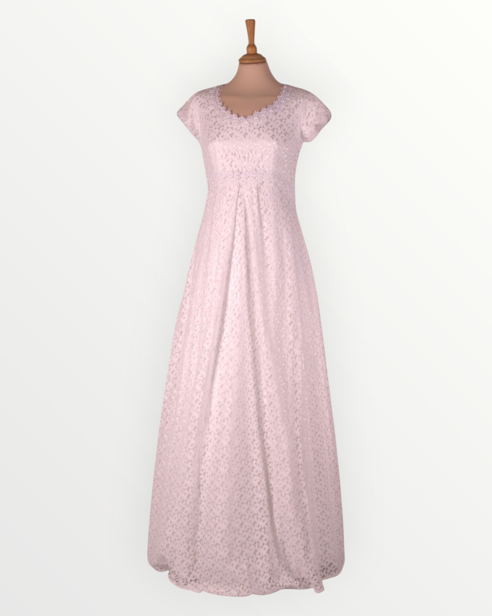 Ampiirlõikeline õhukesest pitsist pruutkleit.  See valgest pitsist pulmakleit sobib ka tulevasele emale.