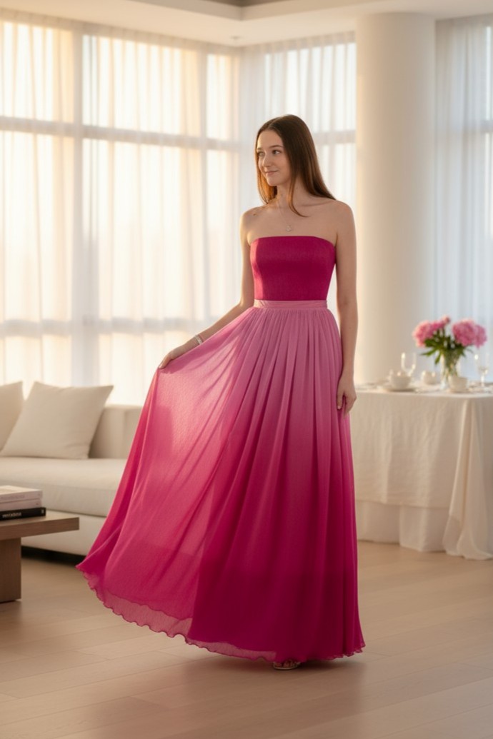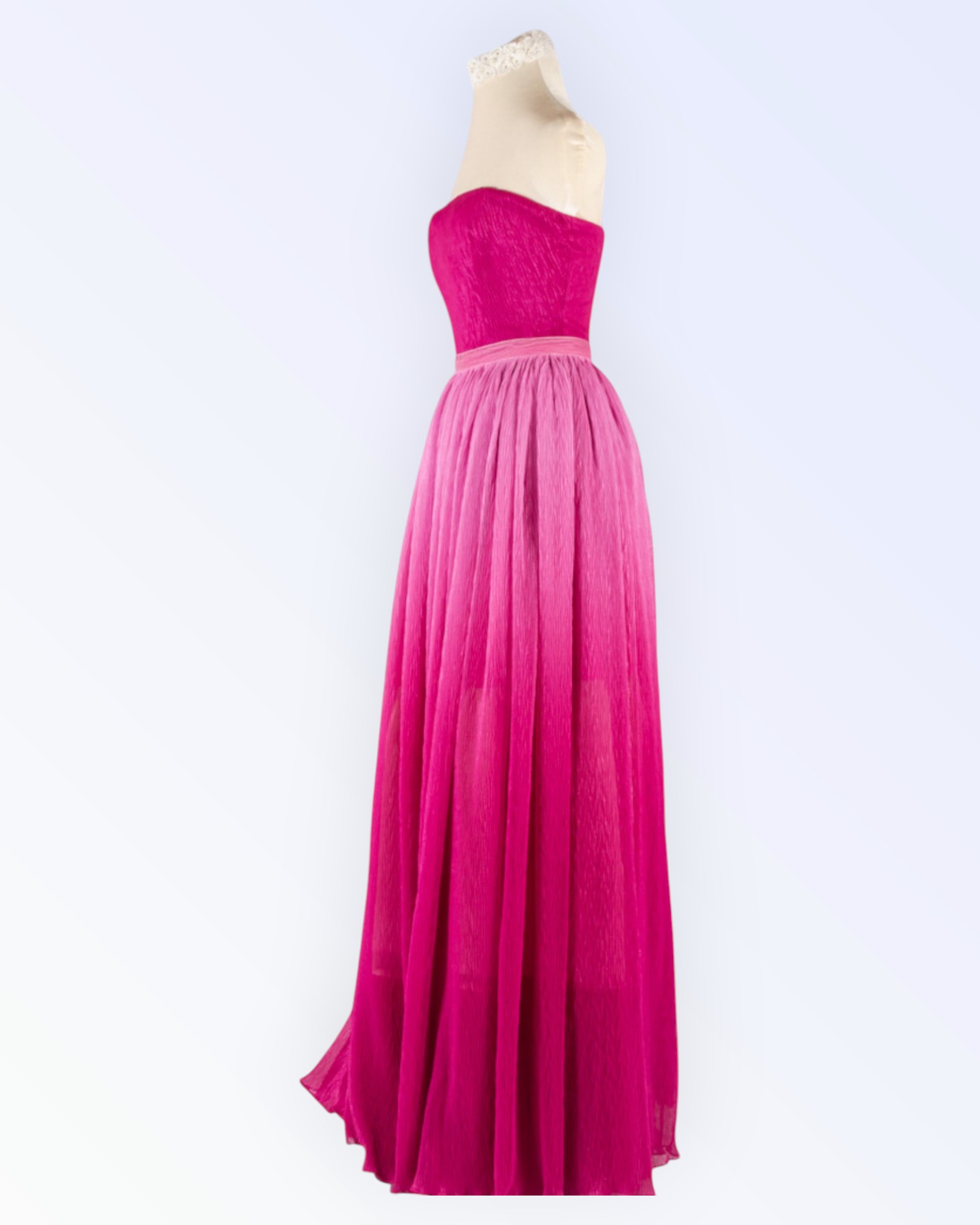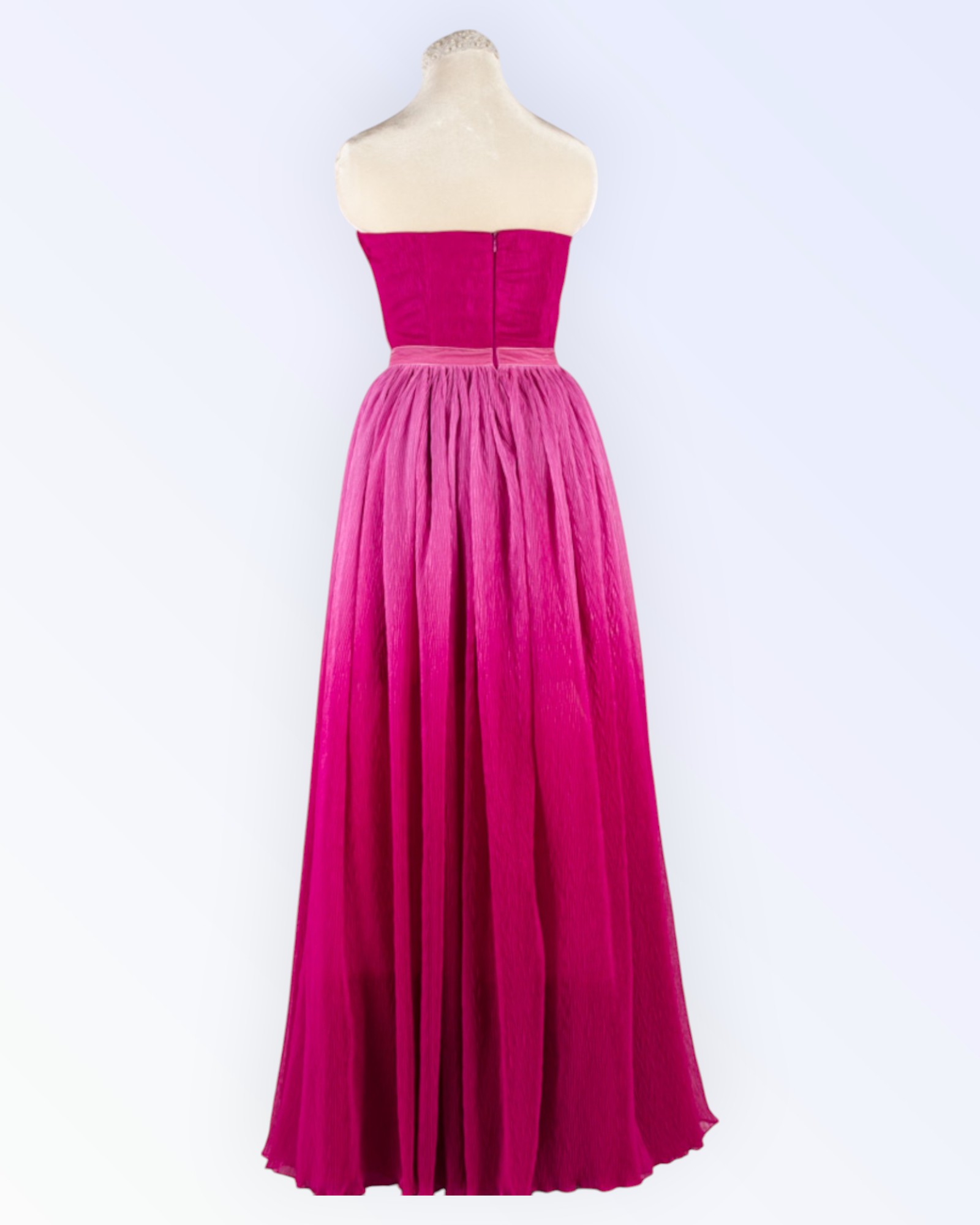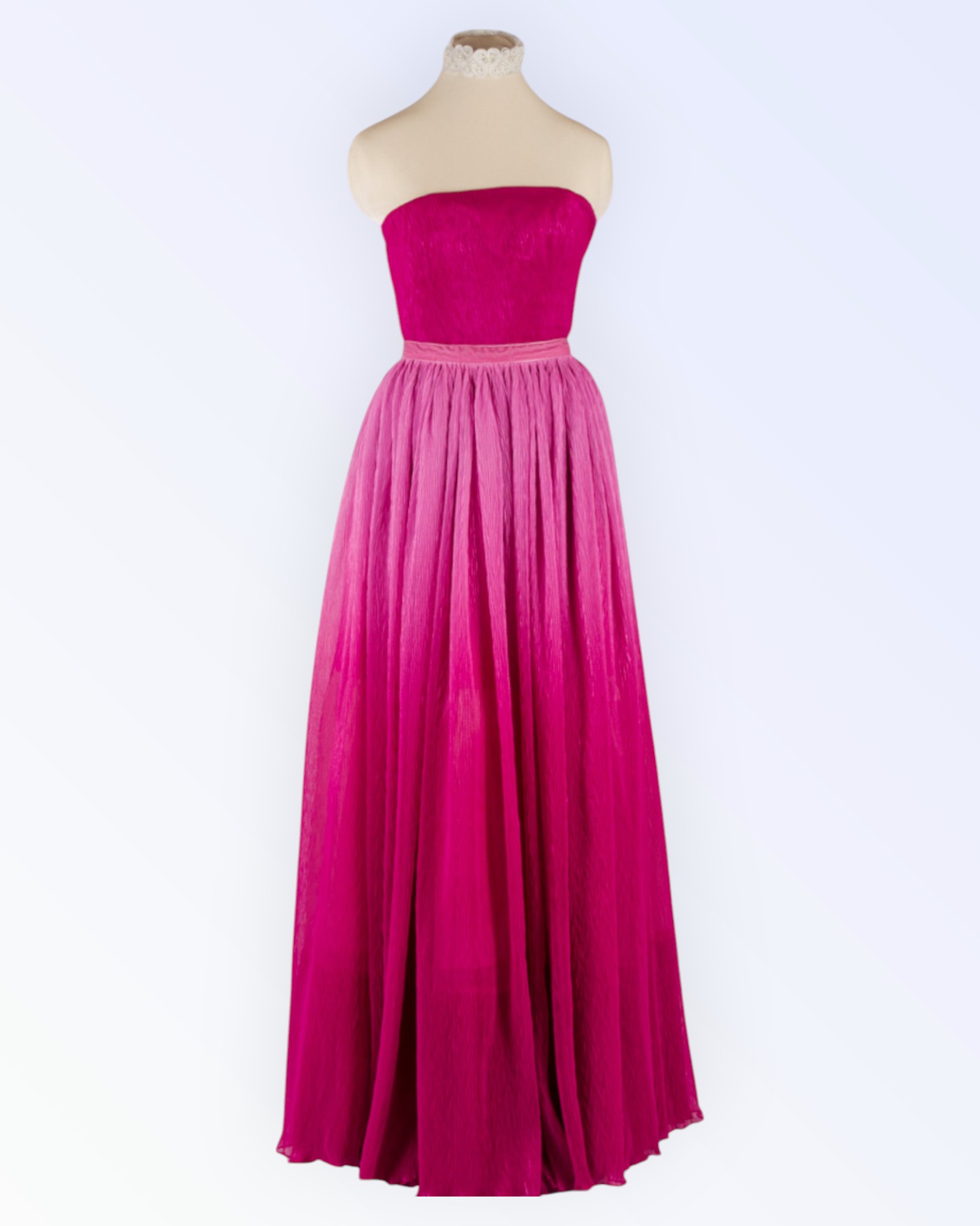 Ombré tehnikaga värvitud gofreeritud organzast ballikleit. Kroogitud seelikuga õlapaelteta kleidil on vööjoon rõhutatud roosa sametpaelaga. Ainueksemplar!