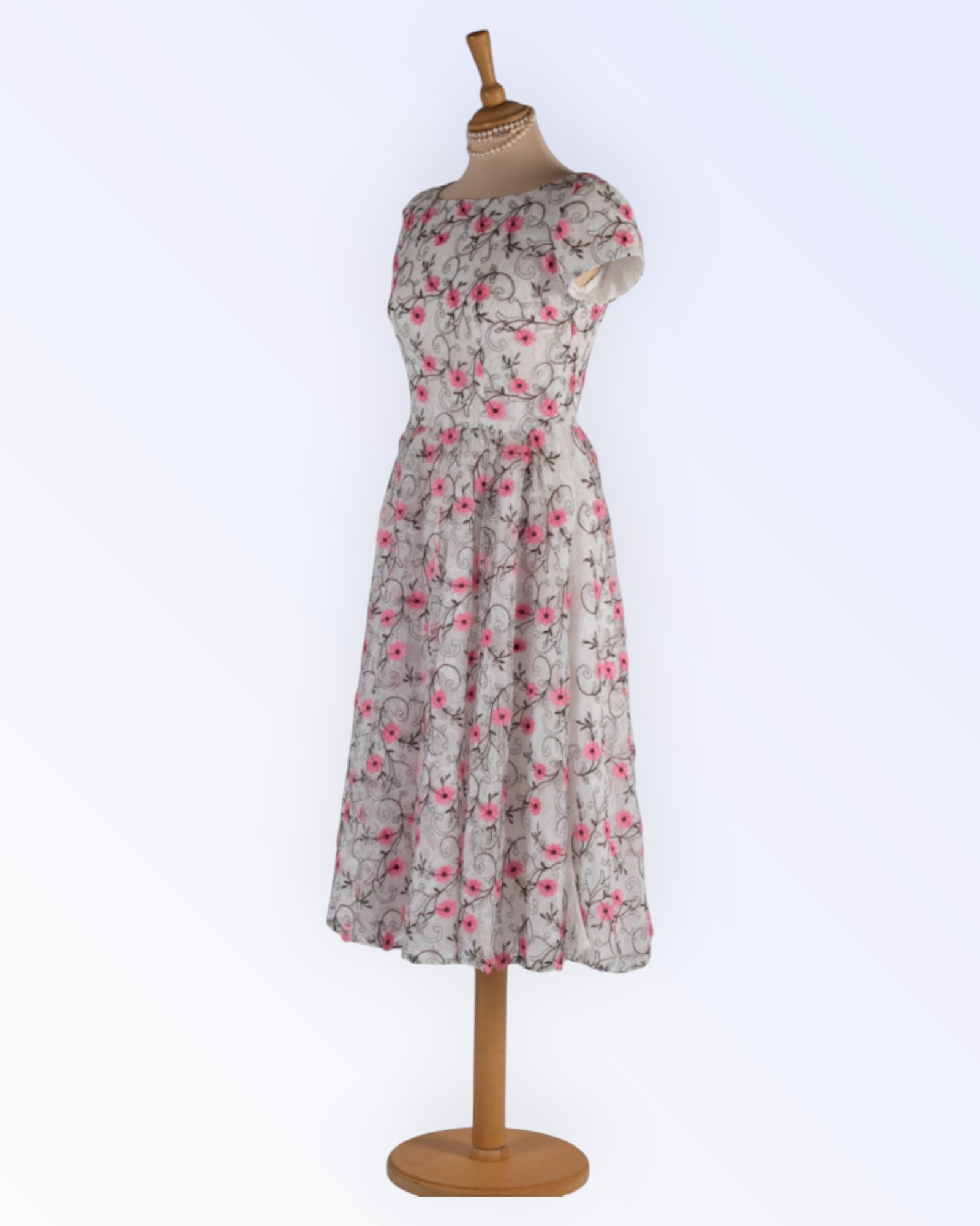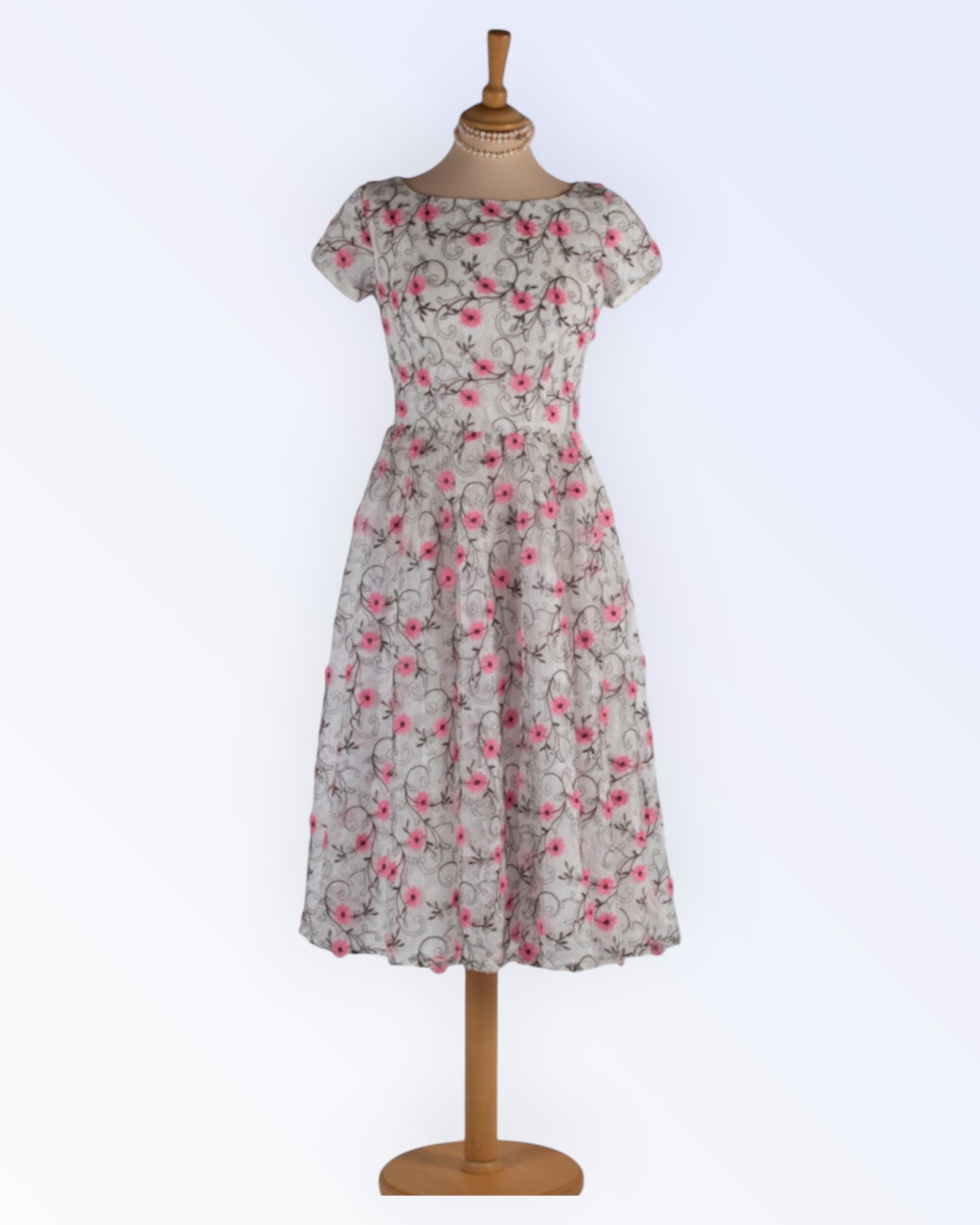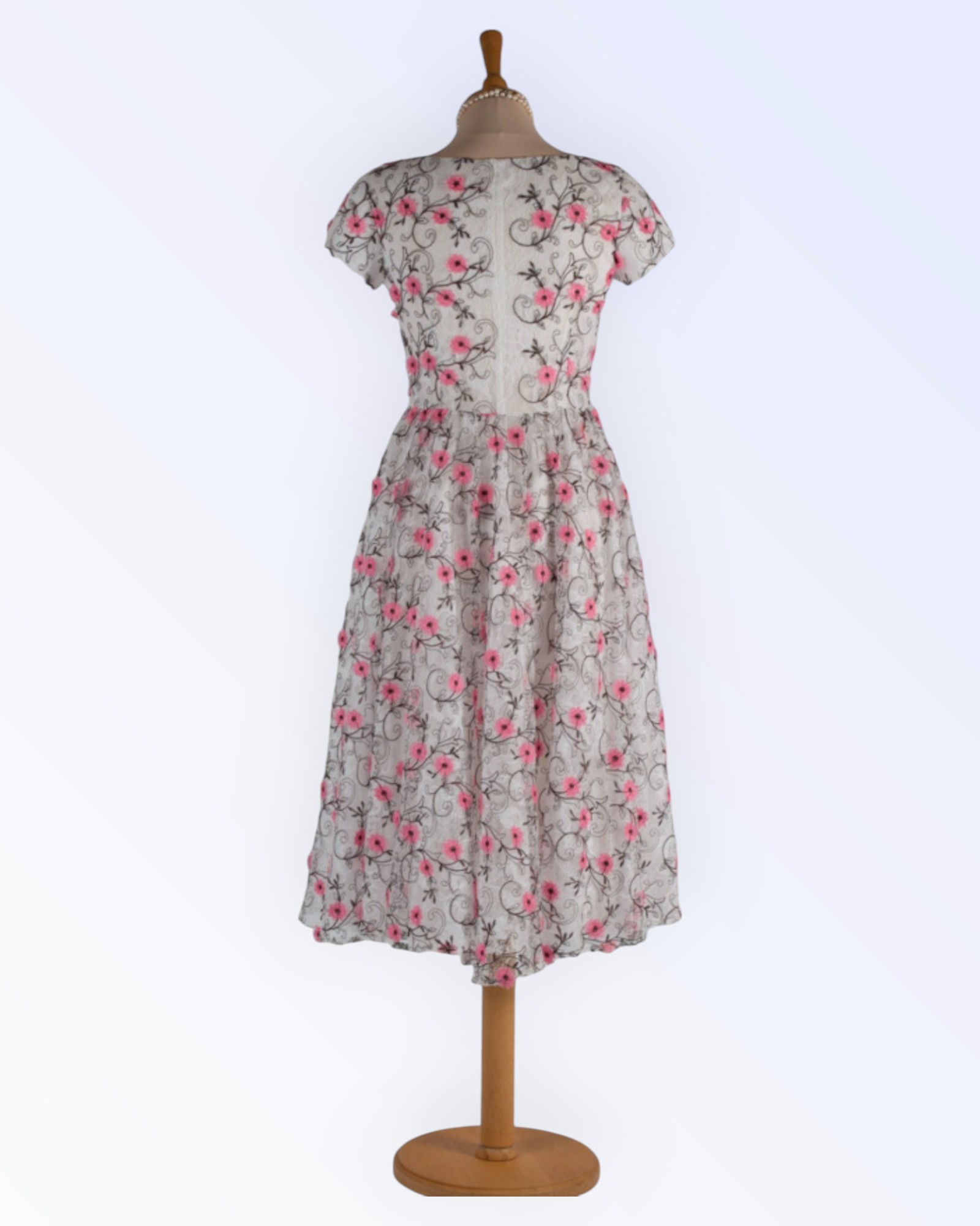 Valgest roosade lilledega 3D pitsist romantilise disainiga pidulik kleit. Kleidil on lühikesed varrukad ja lai kroogitud seelik.
