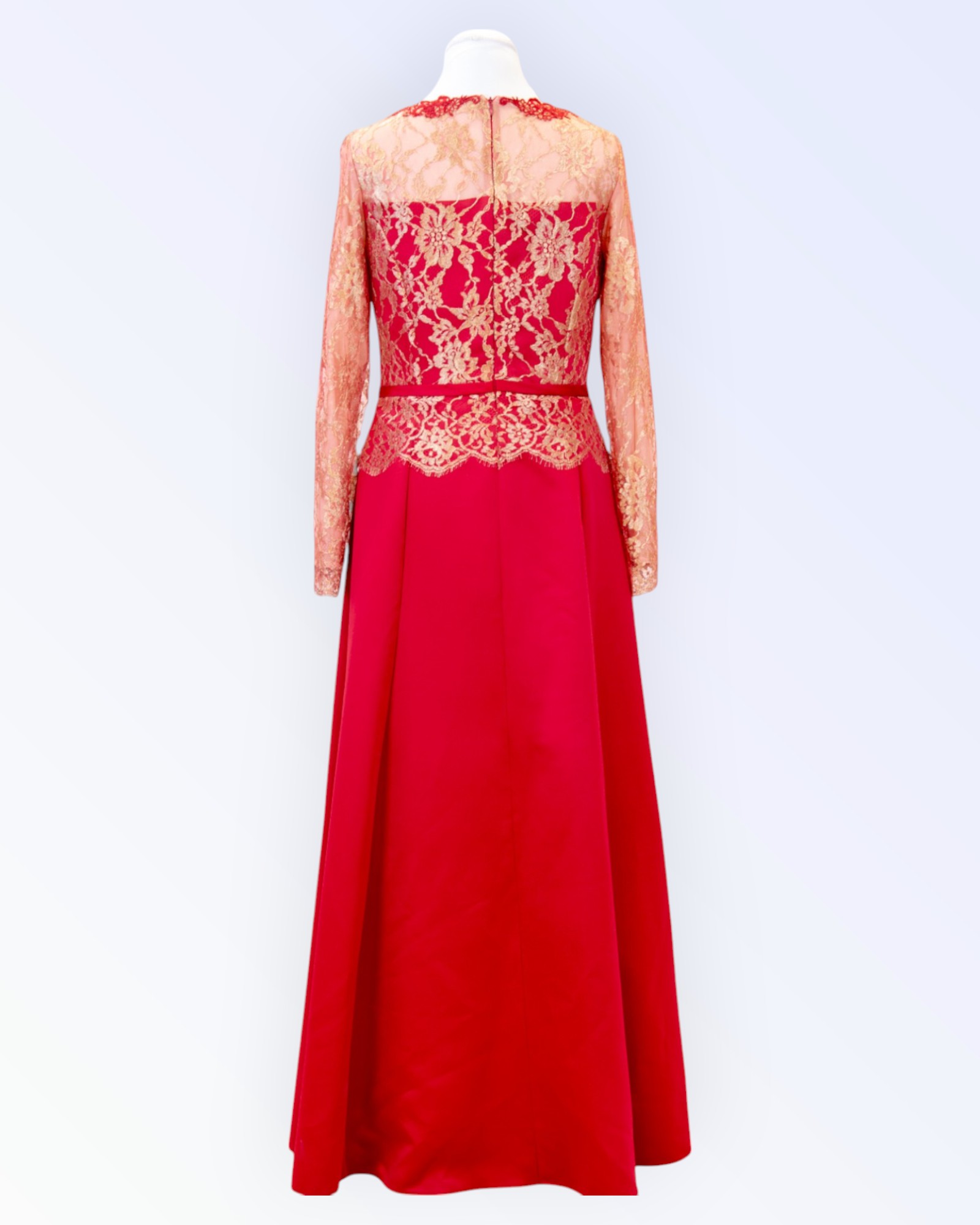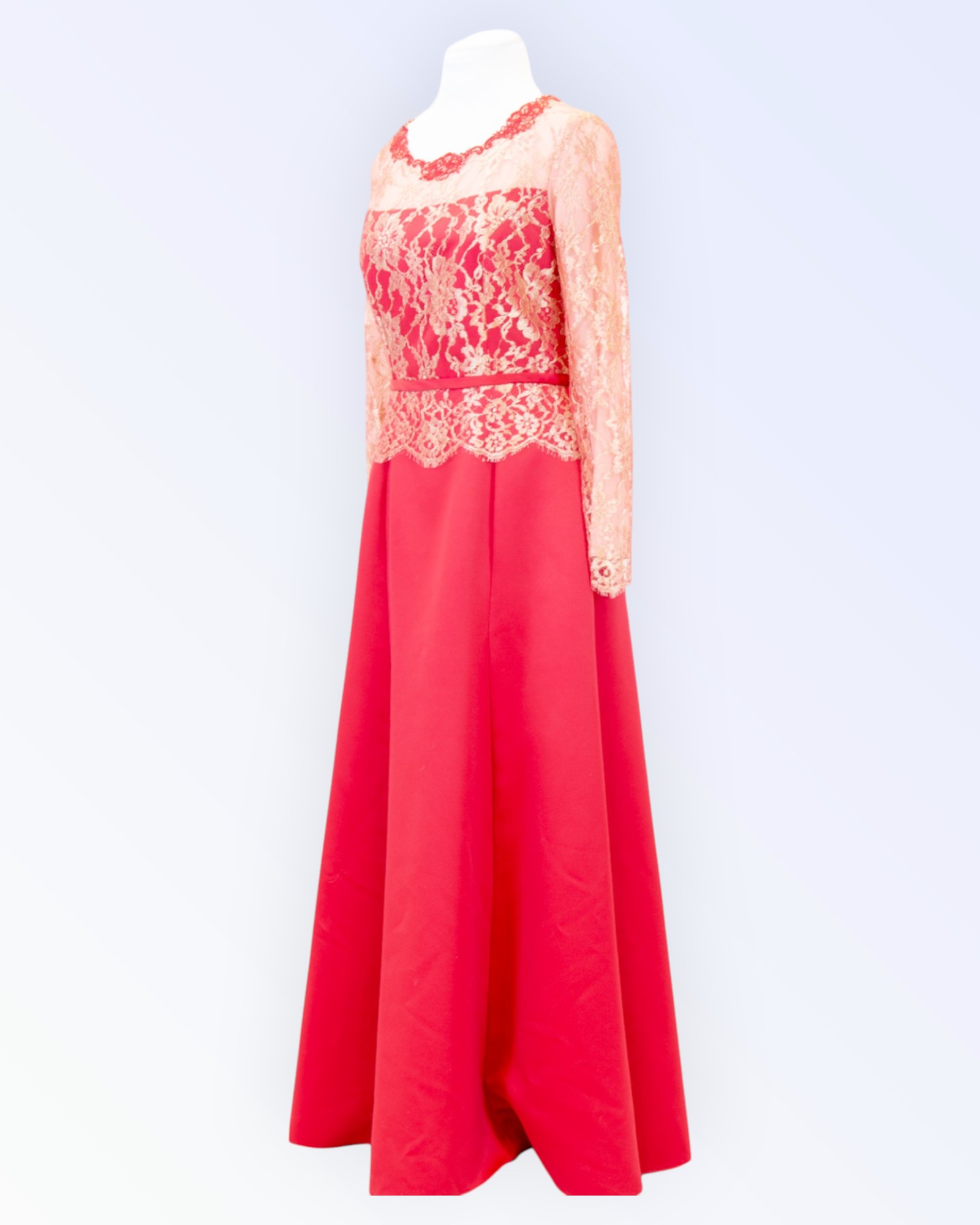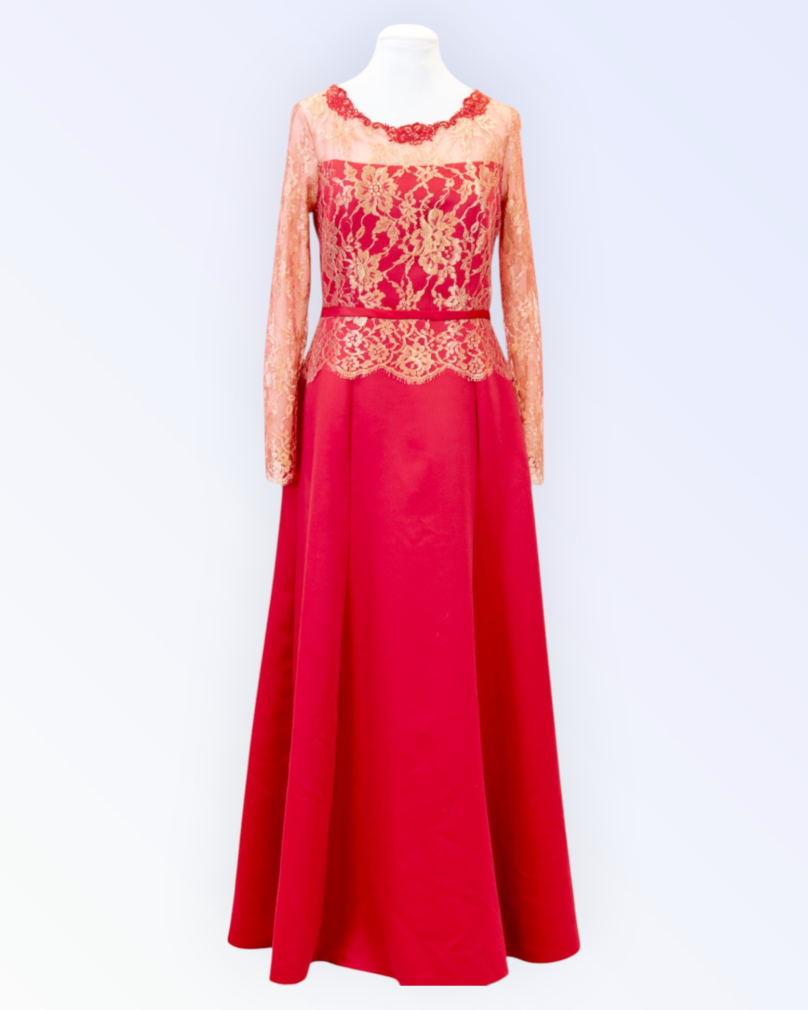 Paksemast punasest satiinist ja luksuslikust Prantsuse pitsist pikk õhtukleit. Soliidse pikkade varrukatega kleidi kaelus on kaunistatud tikitud pitsist motiividega. Ainueksemplar!