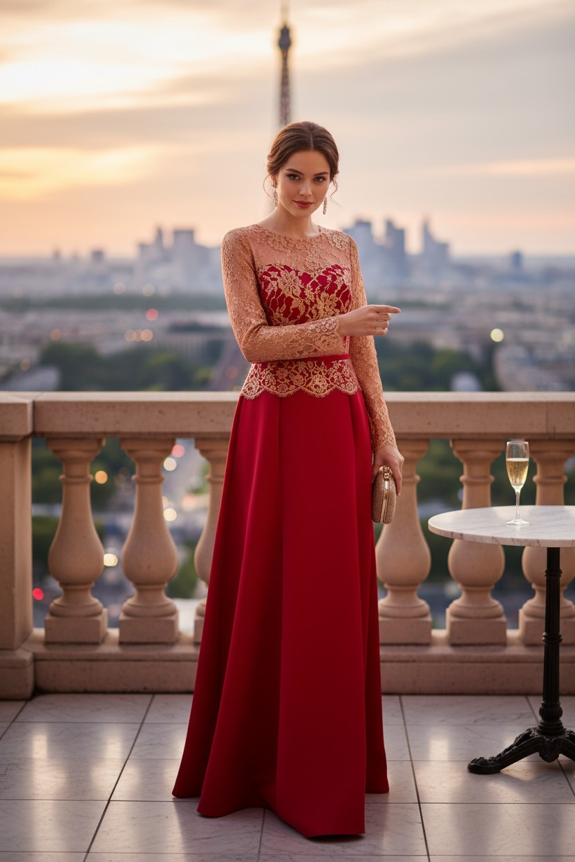 Paksemast punasest satiinist ja luksuslikust Prantsuse pitsist pikk õhtukleit.