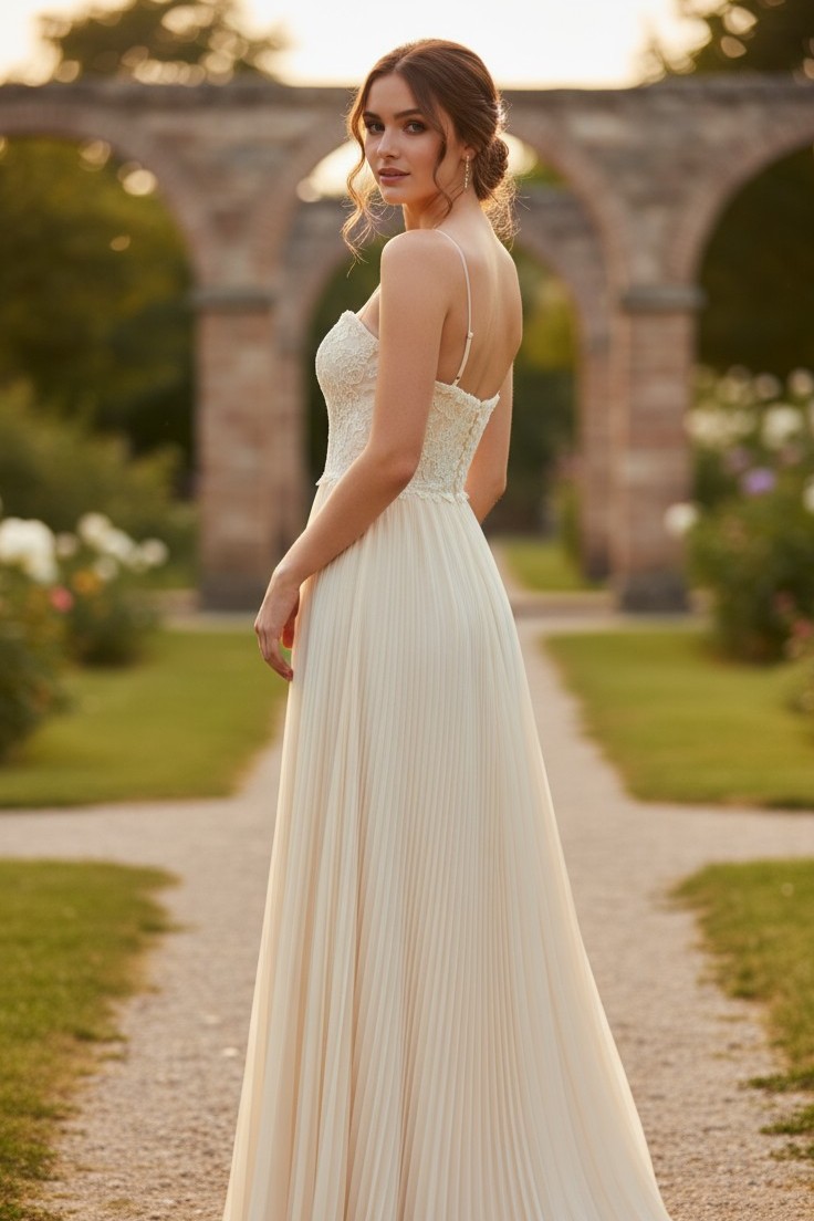 Pliseeritud seelikuga loodusvalge pruutkleit.