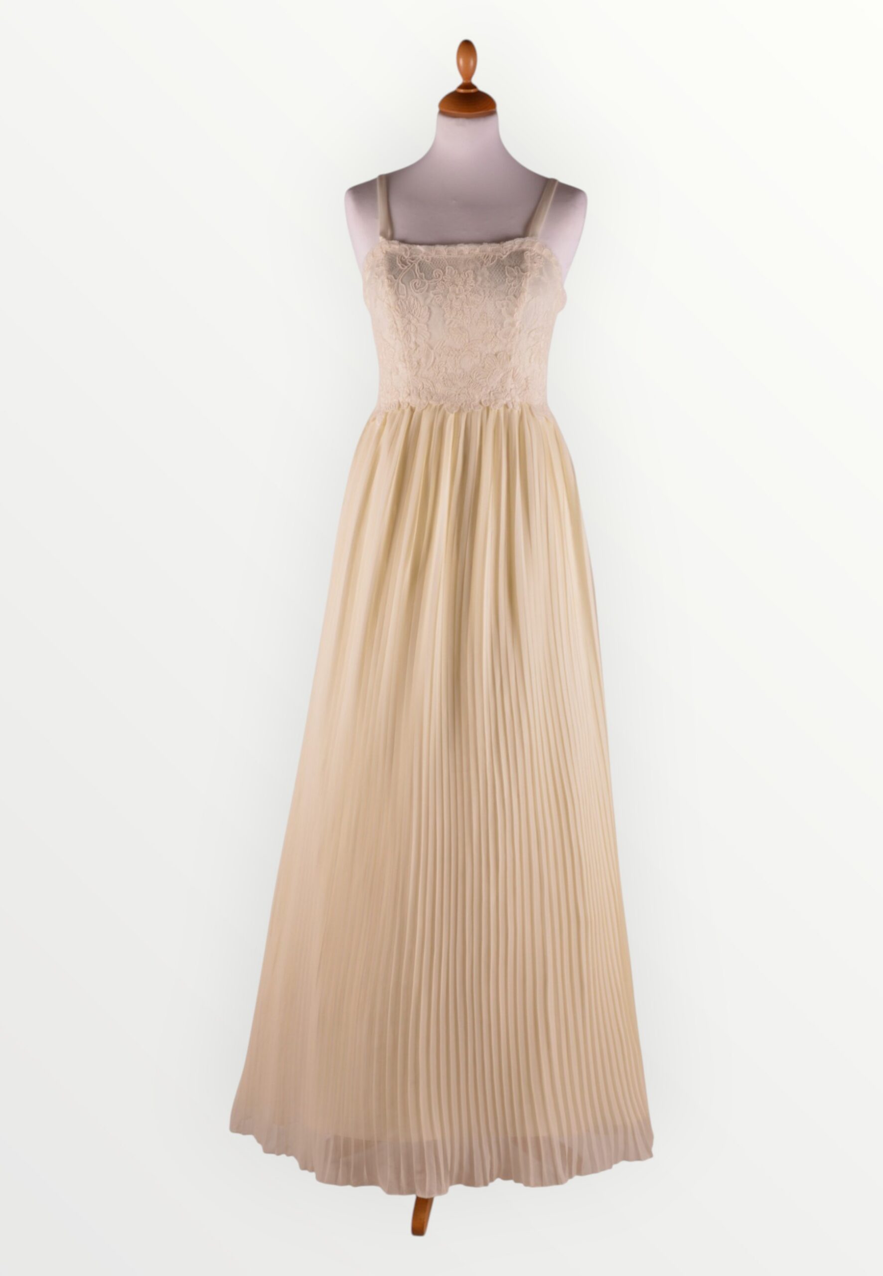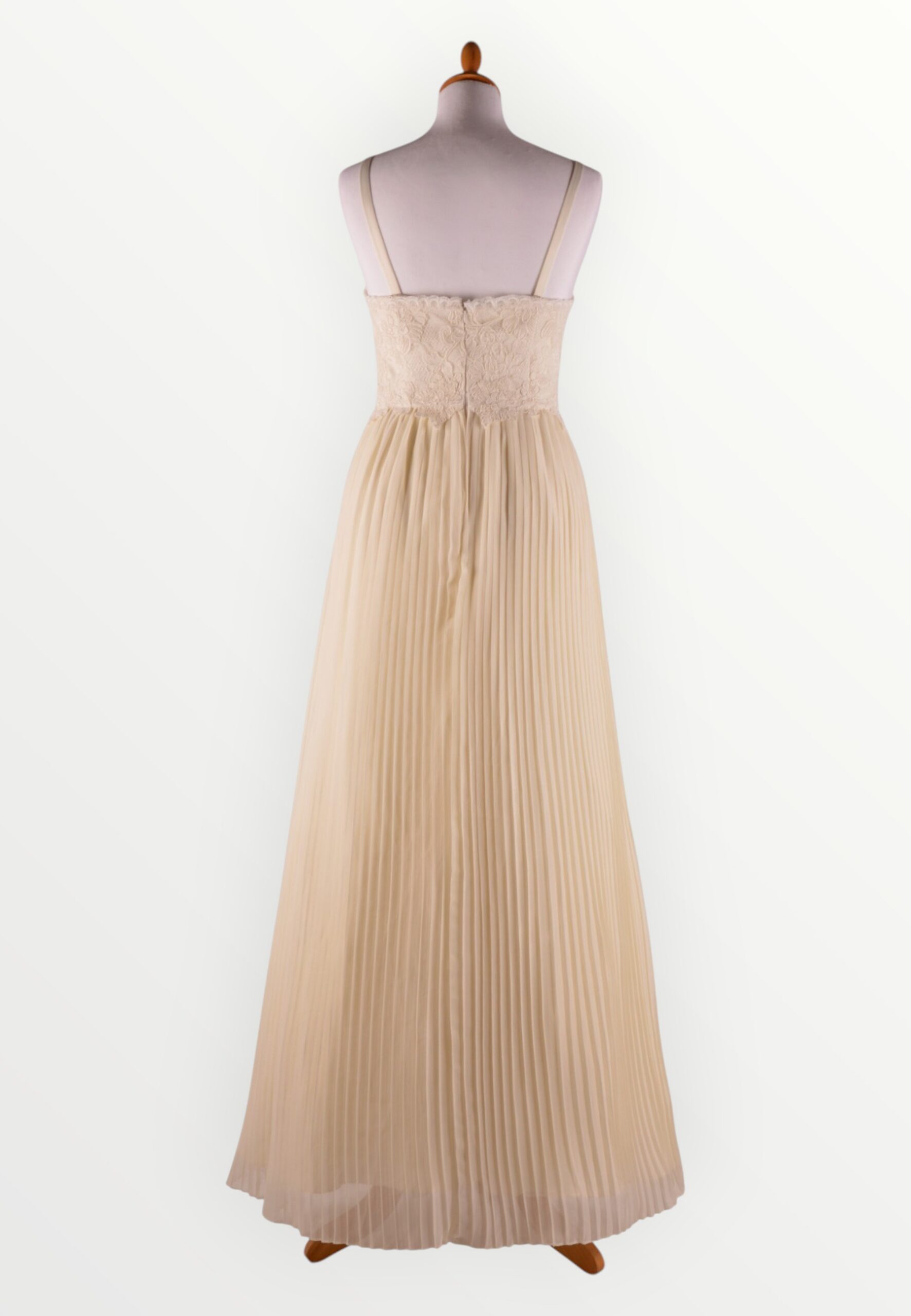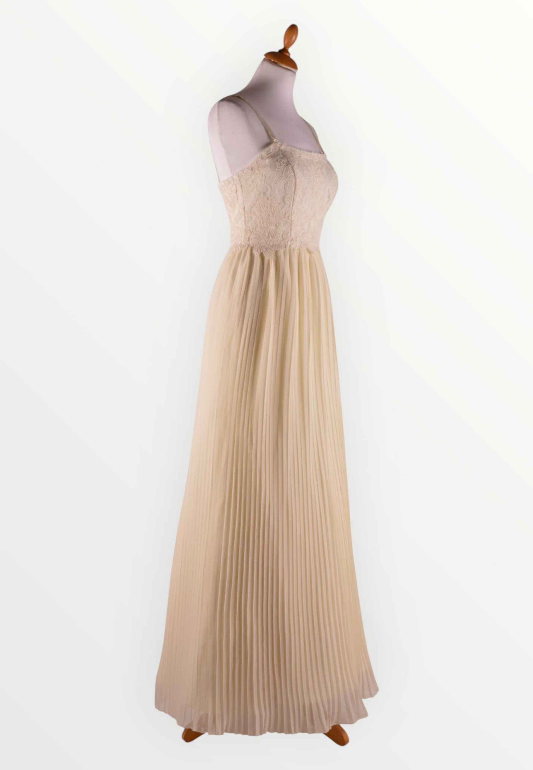 Pliseeritud seelikuga loodusvalge pruutkleit. Õlapaeltega kehaosa on kaetud hinnalise nöörtikandiga pitsiga. Ainueksemplar!
