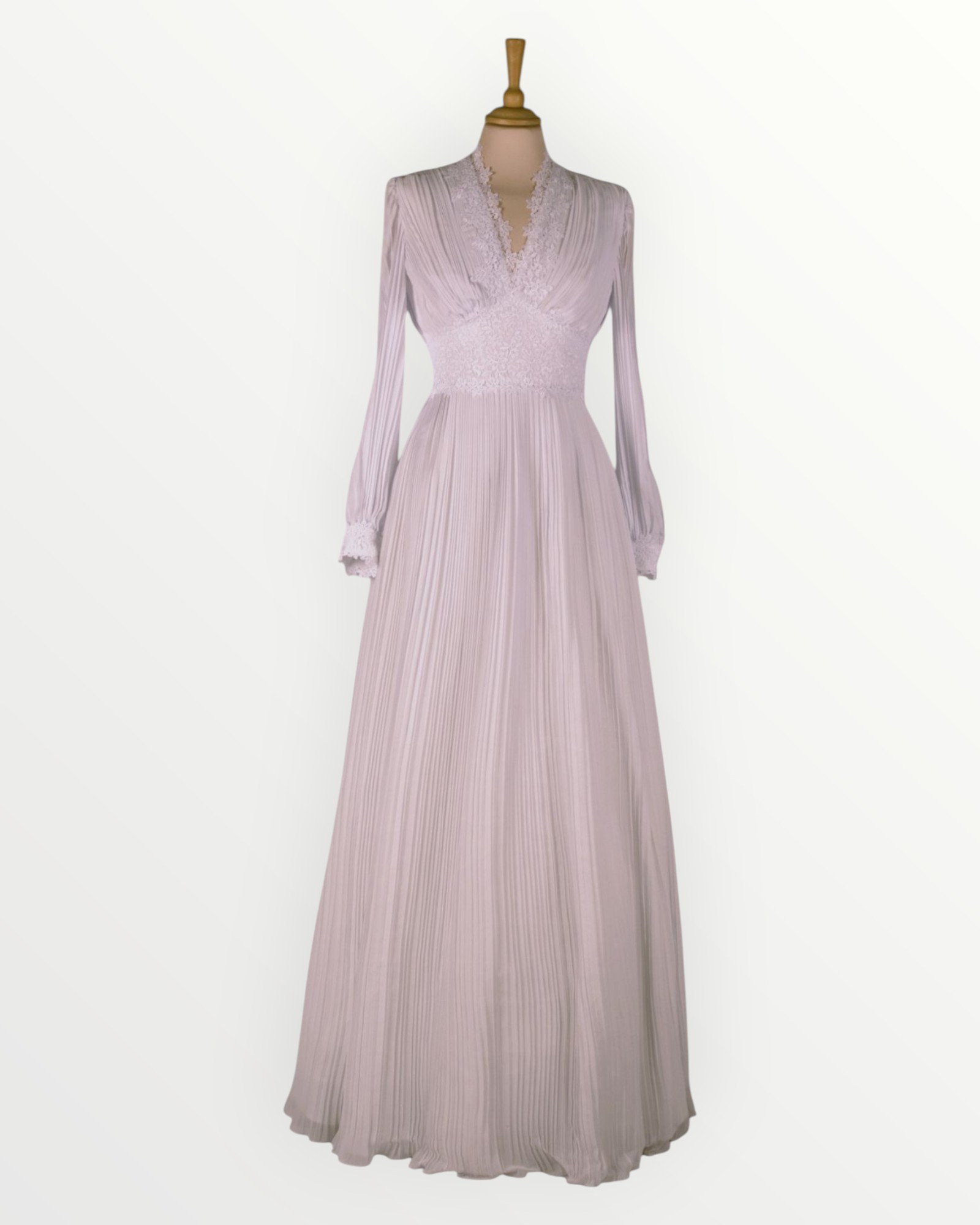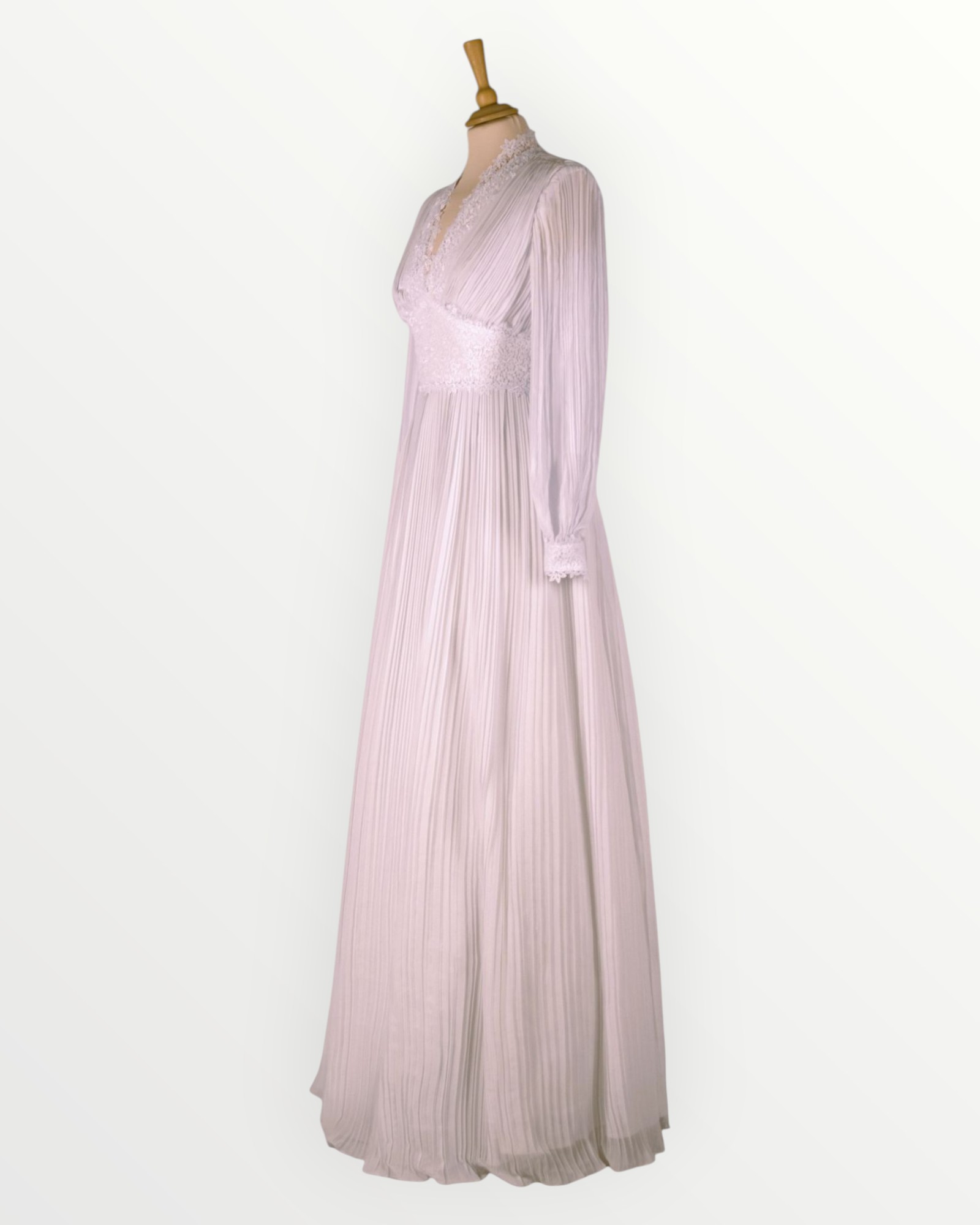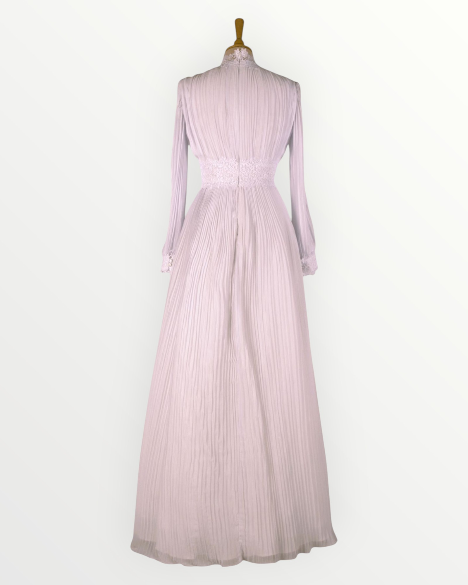 Plisseeritud šifoonist vintage-stiilis pikkade varrukatega valge pulmakleit. Kleidi kaelus, taljejoon ja mansetid on kaetud eksklusiivse valge pitsiga. Seljal tõmblukk.