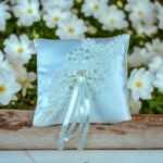 Loodusvalgest satiinist pitsiga kaetud sõrmusepadi. Kaunistatud klaashelme ja satiinlintidega.