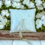 Loodusvalgest satiinist pitsiga kaetud sõrmusepadi. Kaunistatud klaashelme ja satiinlintidega.