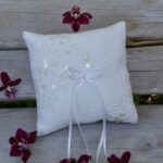 Loodusvalgest satiinist pitsiga kaetud sõrmusepadi. Kaunistatud klaashelme ja satiinlintidega.