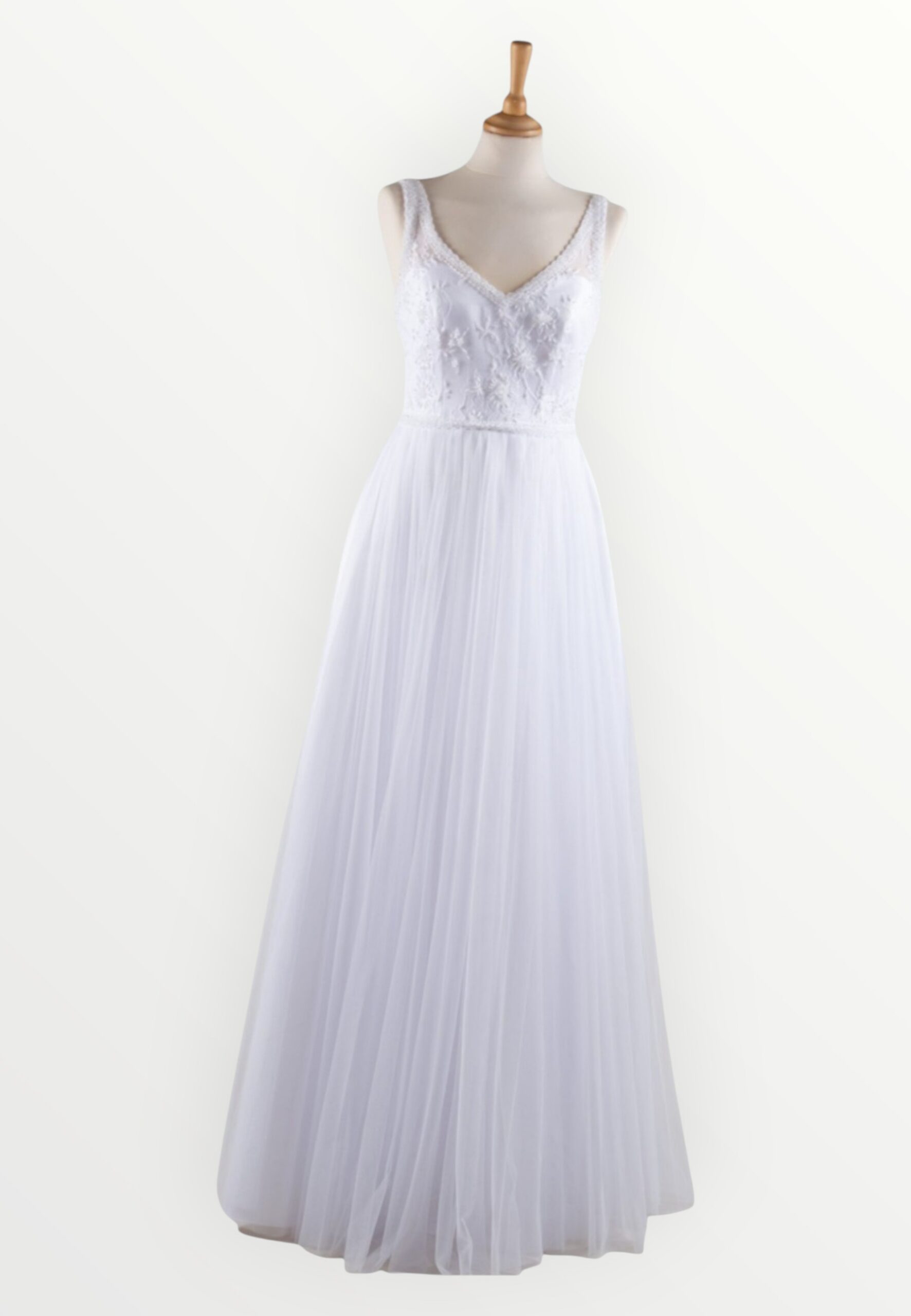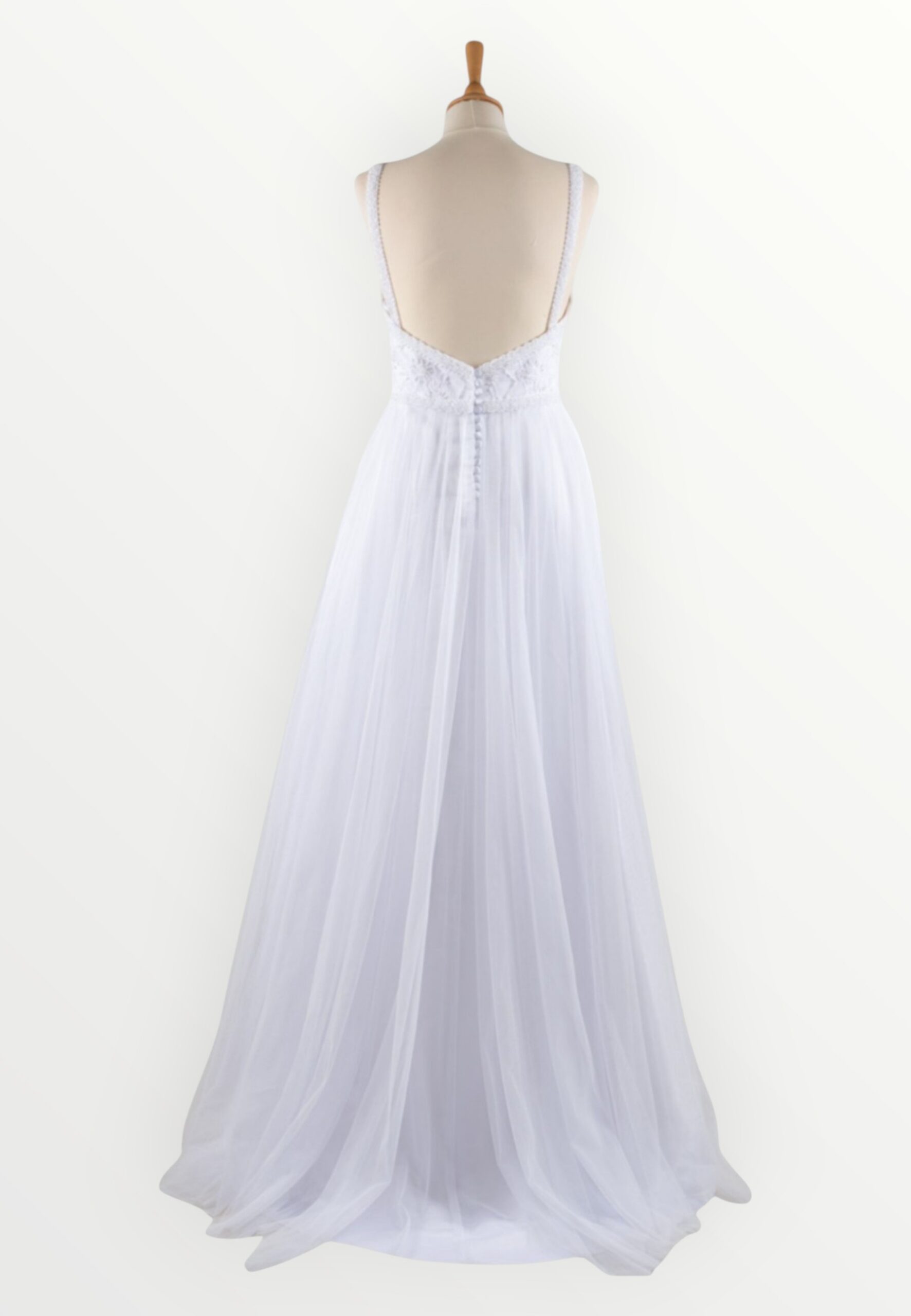 Tüllseeliku ja avatud seljaosaga romantiline pruutkleit. Kaeluseäär, õlapaelad ja vööjoon kaunistatud  helmestega.