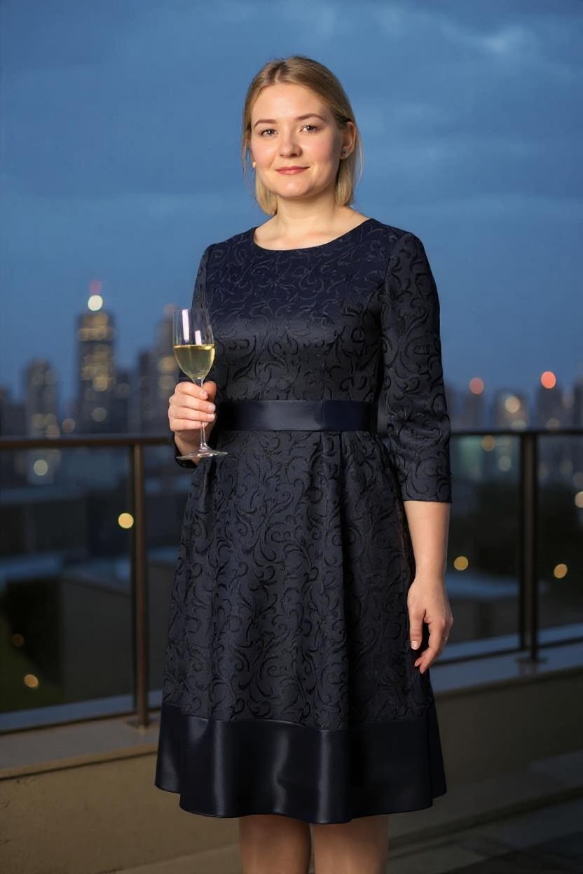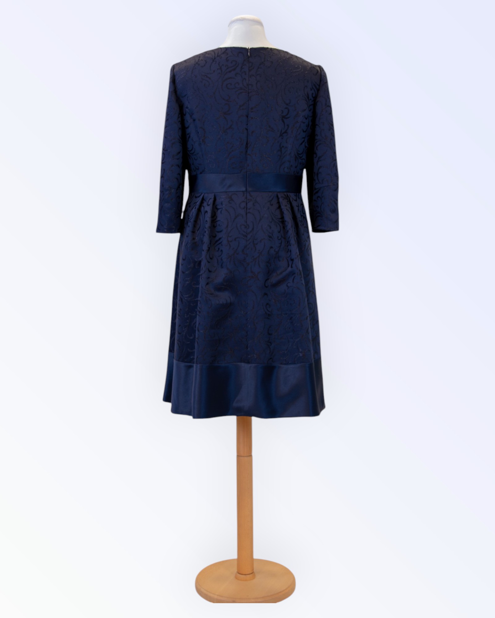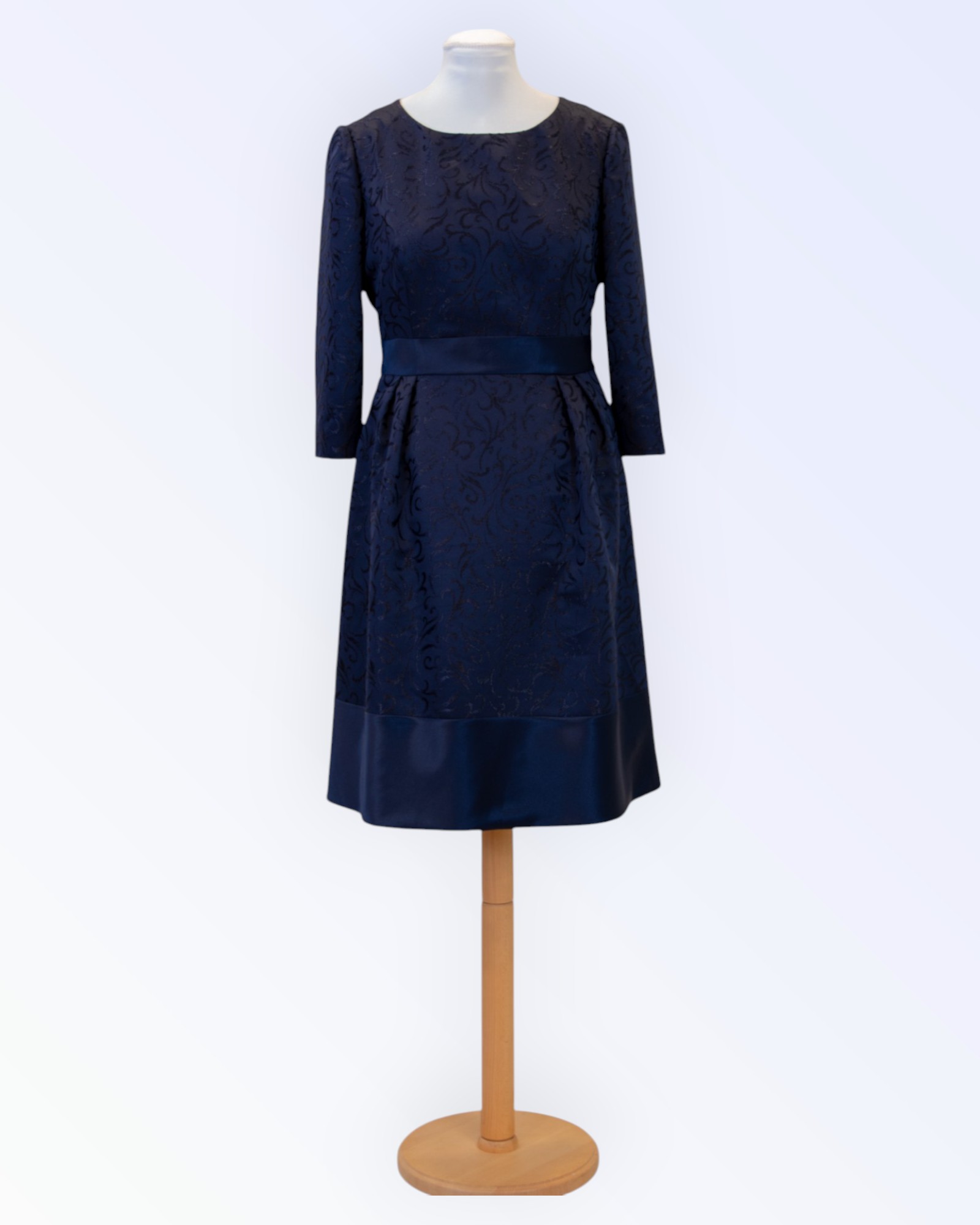 Tumesinisest žakaarkangast pidulik kleit. Kleidil on voltidega seelikuosa ja poolpikad varrukad. Voodriga toode. Ainueksemplar!