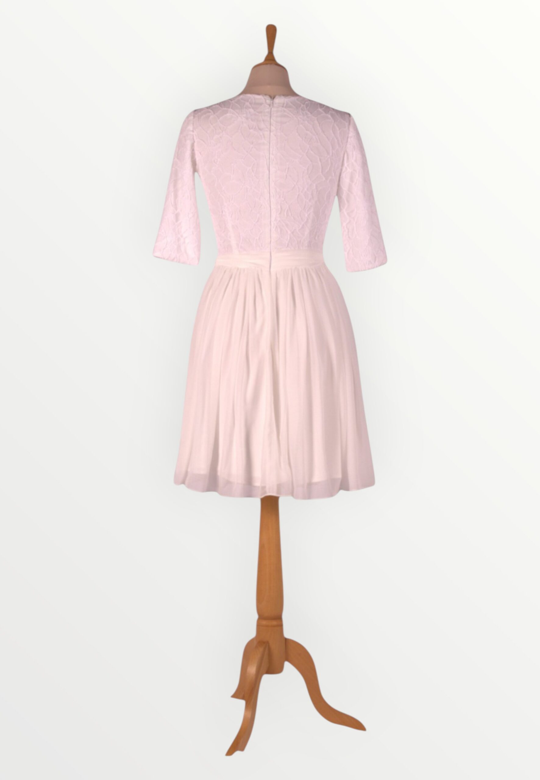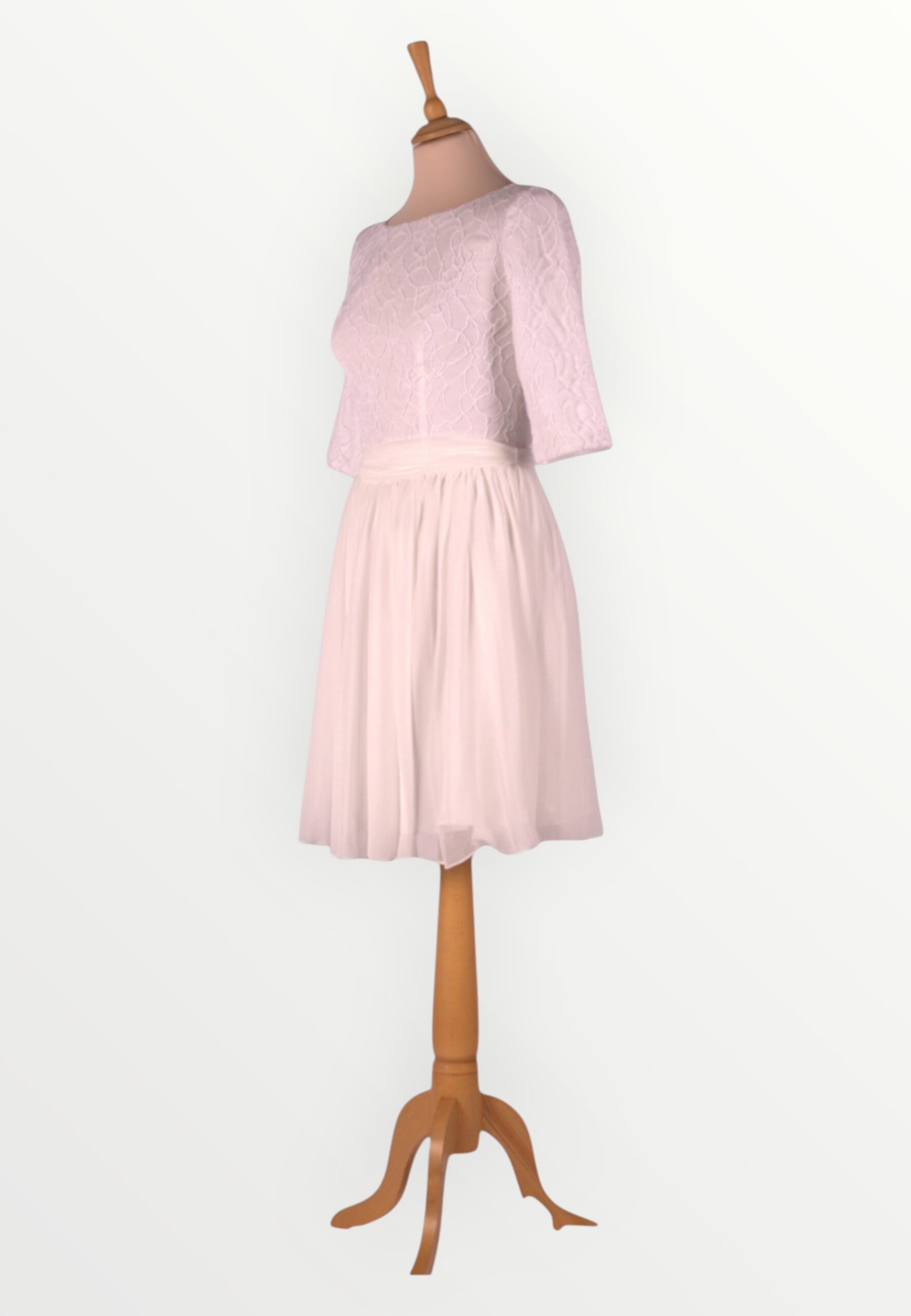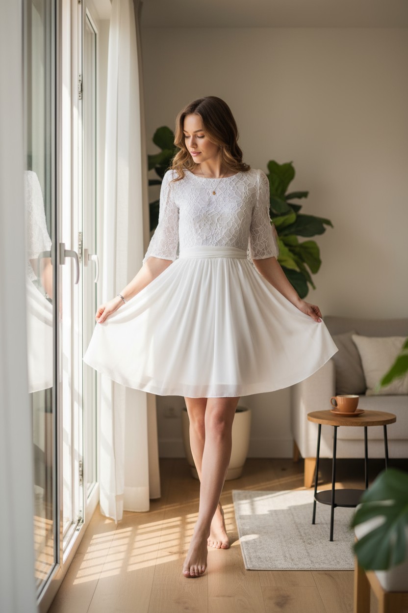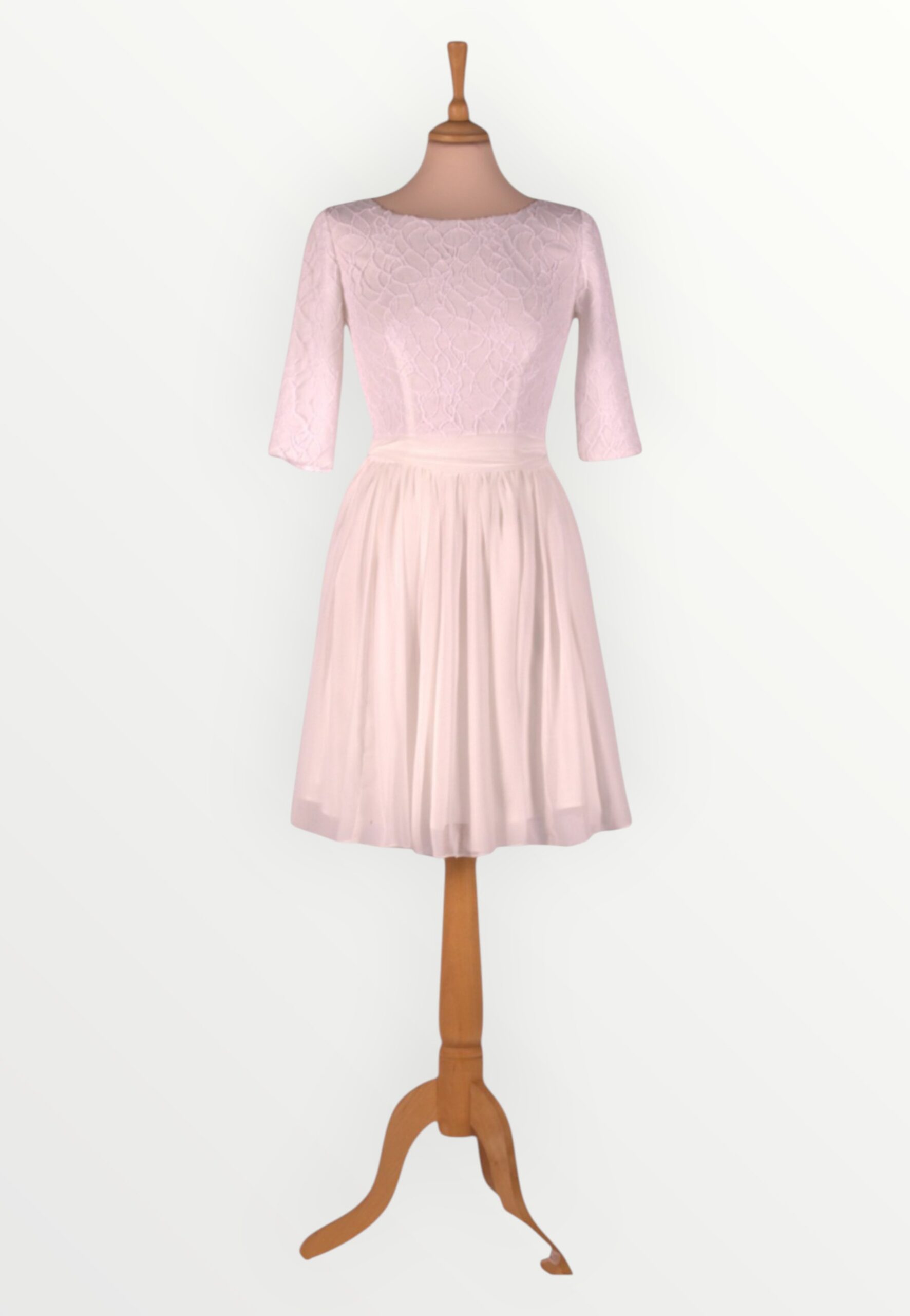 Väike valge kleit, mille kroogitud seelikuosa on õrnast sifoonist ja kehaosa kaetud eksklusiivse prantsuse pitsiga. Kleidil on poolpikad varrukad.