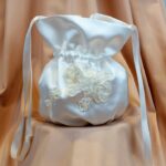 Valgest satiinist pitsi ja pärlitega kaunistatud kotike pruudile.