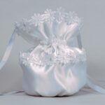Valgest satiinist pitsi ja pärlitega kaunistatud kotike pruudile.