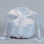 Valgest satiinist pitsi ja pärlitega kaunistatud kotike pruudile.