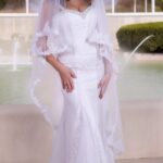 Kahekordne kellukesekujuline satiinkandiga ääristatud poolpikk pruudiloor.