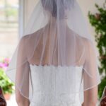 Kahekordne kellukesekujuline satiinkandiga ääristatud poolpikk pruudiloor.