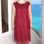 Paksemast punasest satiinist ja luksuslikust Prantsuse pitsist pikk õhtukleit.