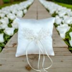 Loodusvalgest satiinist sõrmusepadi mille pealmine pool on kaunistatud pitsmotiiviga.