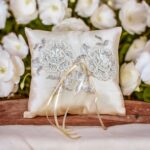 Loodusvalgest satiinist sõrmusepadi mille pealmine pool on kaunistatud pitsmotiiviga.